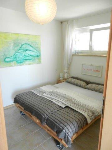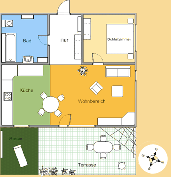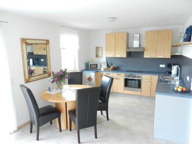 Die Ferienwohnung befindet sich in einem Neubau (2007/2008) und ist mit Fußbodenheizung und Lüftungsanlage ausgestattet. Sie verfügt über ein Schlafzimmer, großzügigem Wohnraum mit Küche und Essbereich so wie Schlafgelegenheit für zwei zusätzliche Personen auf einer Schlafcouch.