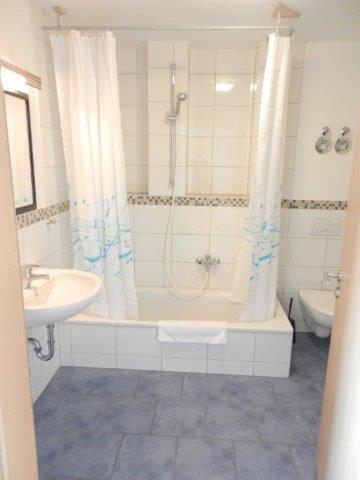 Das Badezimmer ist mit einer Badewanne mit Dusche ausgestattet.